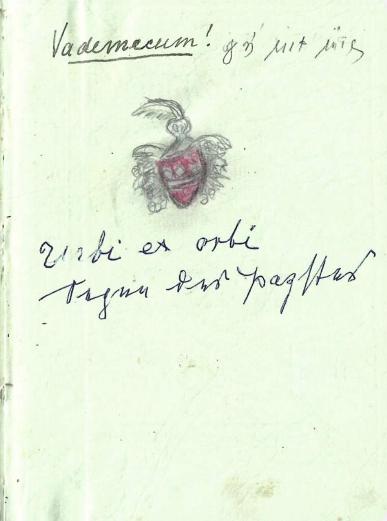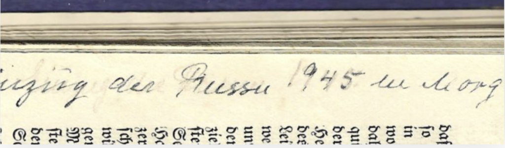 Vademecum (Büchlein als unentbehrlicher Fluchtbegleiter) meiner Großtante Wanda von Elbe, in der Sie Stationen ihrer Flucht vom Gut Morgow in Pommern bis nach Schleswig-Holstein festgehalten hat.