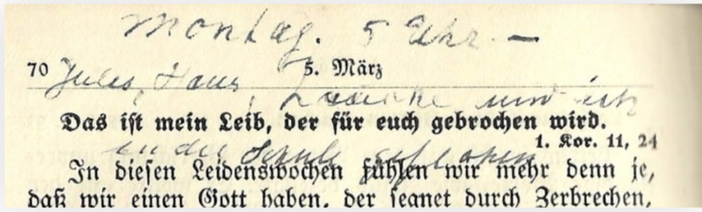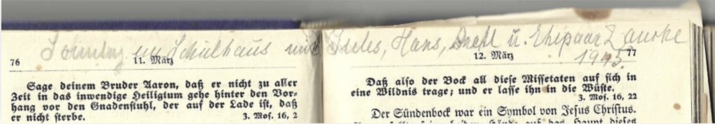 Sonntag, 11. März (1945) im Schulhaus mit Jules, Hans, Brettl u. Ehepaar Laurke