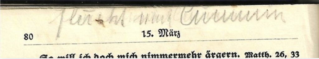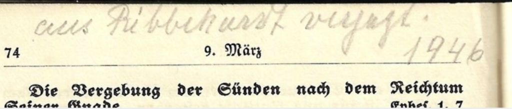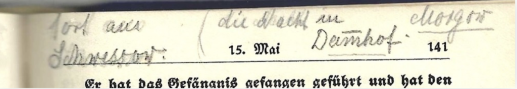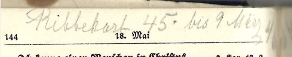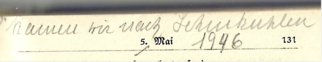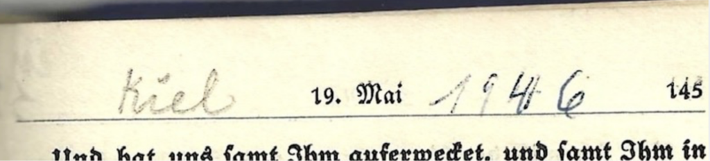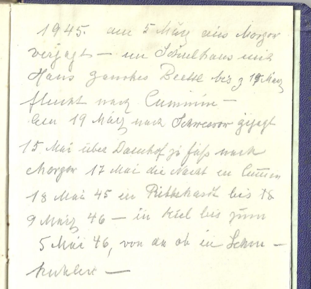 15. Mai über Damhof zu Fuß nach Morgow; 17. Mai die Nacht in Cummin; 18. Mai 45 in Ribbekart bis 9. März 46 – in Kiel bis zum 5. Mai 46; von da ab in Lehmkuhlen –