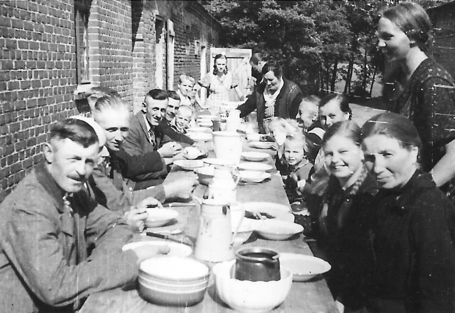 Im Anschluss folgte das gemeinsame Mittagessen aller Dorfbewohner. An langen Tischen (Bretter auf Böcke gelegt) nahmen die Familien Platz. Viele fleißige Helferinnen hatten in der Gutsküche alles gut vorbereitet.