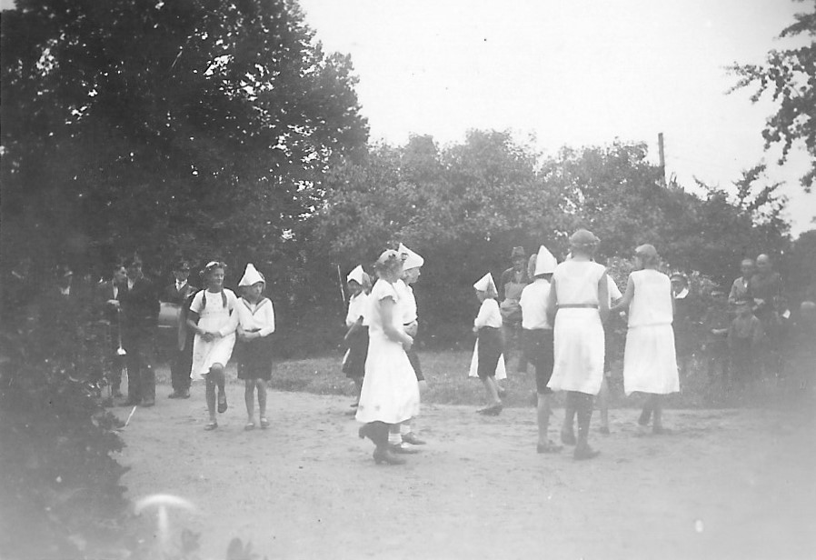 Am Nachmittag fand dann das Volksfest auf dem großen Wirtschaftshof statt. Nun waren die Kinder die Hauptpersonen. Der Stellmacher hatte in langer, mühevoller Arbeit drei kunstvolle Holztauben angefertigt, bunt bemalt und mit Bändern verziert. Die großen Jungen und Mädchen und die jüngeren Schulkinder nahmen vor je einer Taube Aufstellung und der Reihe nach warf jeder mit seinem Taubenknüppel nach der Taube. Hatte ein Kind ein Stück der Taube abgeworfen, durfte es sofort geholt werden, denn dafür gab es am Ende die Preise. Das schwierigste Stück war der Rumpf, der auch den ersten Preis und die Königswürde einbrachte.