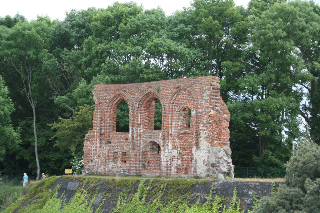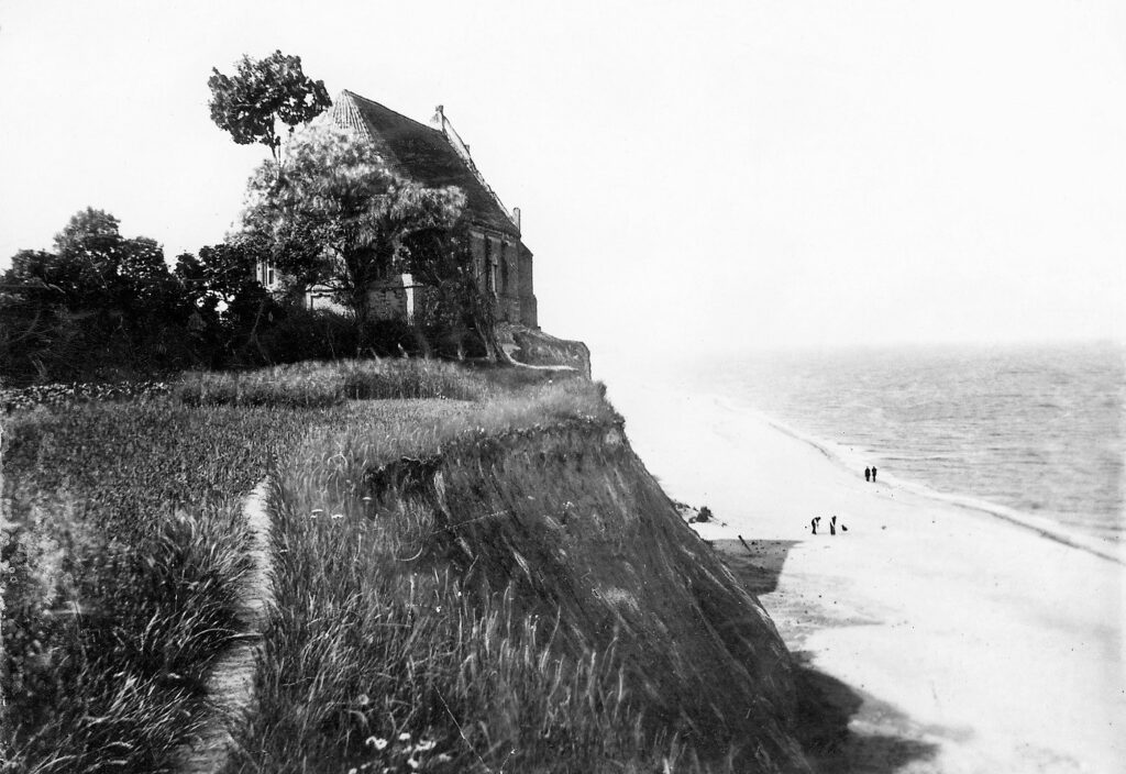 Unsere Kindheitsbesuche dort waren voll besonderer Freuden, durch den großen Garten mit seinen vielen Riesen-Weinbergschnecken und vor allem durch die Lage des Gutes unmittelbar an der See. Auf der hohen Steilwiese lag die uralte Kirche, die mein Vater als Amtsvorsteher der Gefahr des Abstürzens halber wohl Mitte der 60ger Jahre hatte schließen lassen. Es ging aber damals noch ein breiter Weg zwischen dem Rand der Düne und der Kirche hindurch, während jetzt nur noch der letzte Rest der Südwand vorhanden ist. Immer noch aber spült die See in den Herbst- und Frühlingstürmen, wenn sie gegen die hohe Steildüne tobt, Reste des alten Friedhofs fort, und wir ahnungslosen Kinder fanden ein Vergnügen darin, am Strande mit den Totengebeinen zu spielen –und unsere Kinder und Enkel haben es ebenso gemacht.