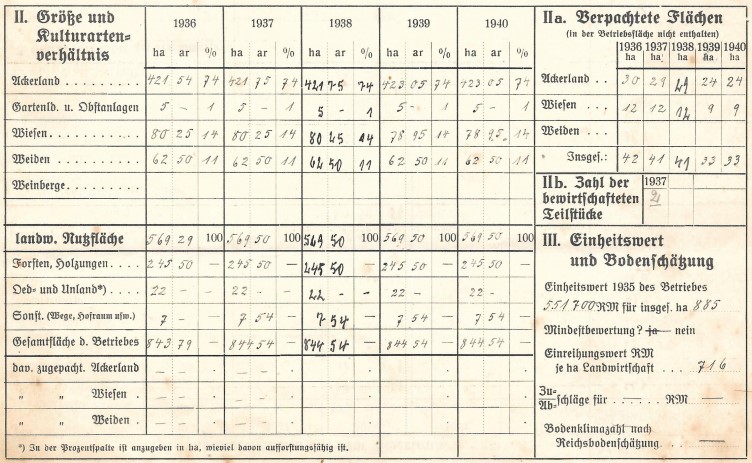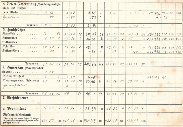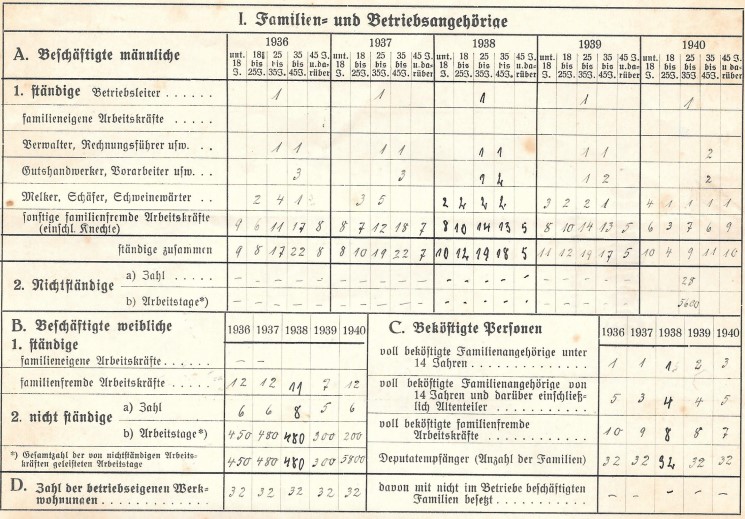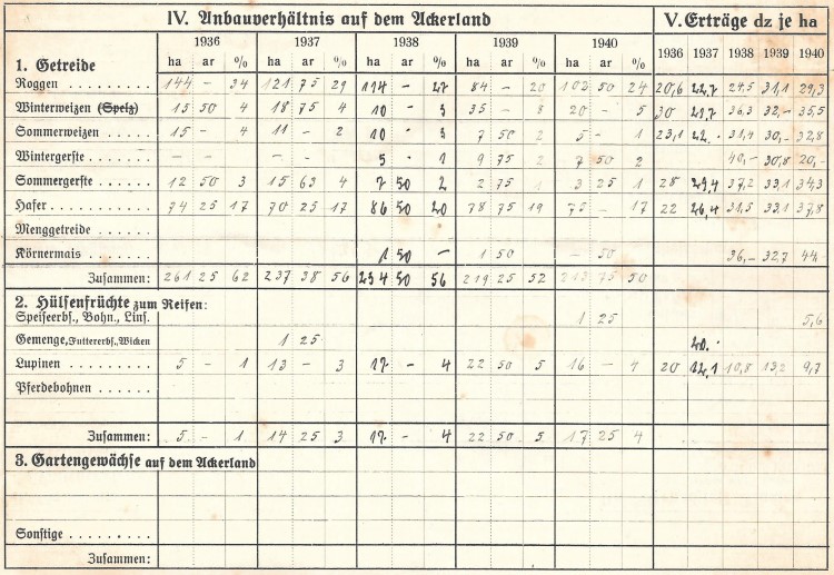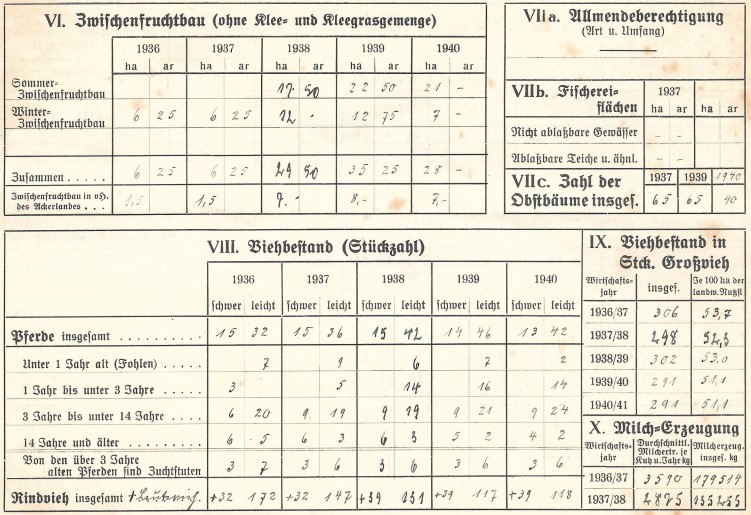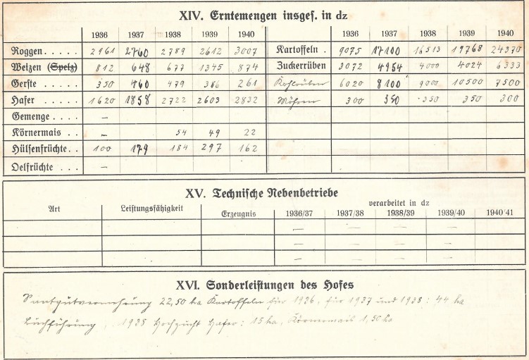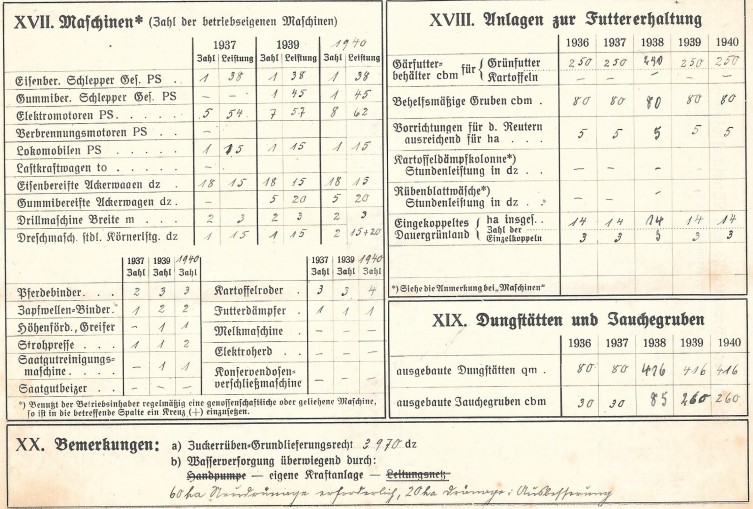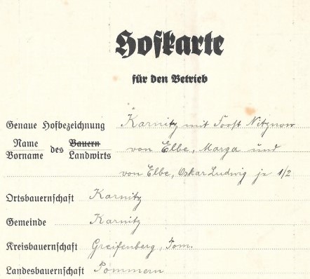 In der Hofkarte zum Gut Karnitz und dem Forst Nitznow wurde durch meine Großeltern für die Jahre 1936-40 die Zahl der Beschäftigten, die Größe der Ackerflächen sowie Erntemengen, den Viehbestand und die auf dem Gut vorhandenen Maschinen festgehalten. Eine sehr interessante Dokumentation dieser Zeit.