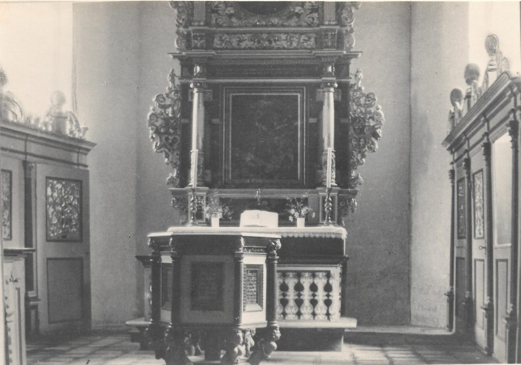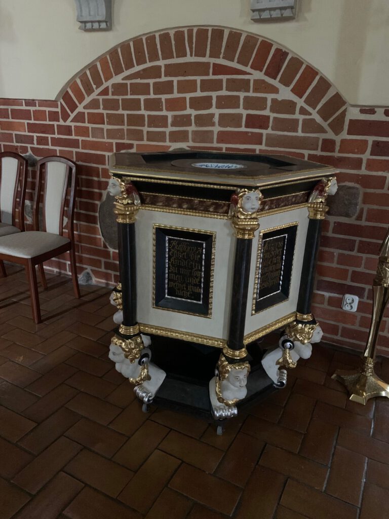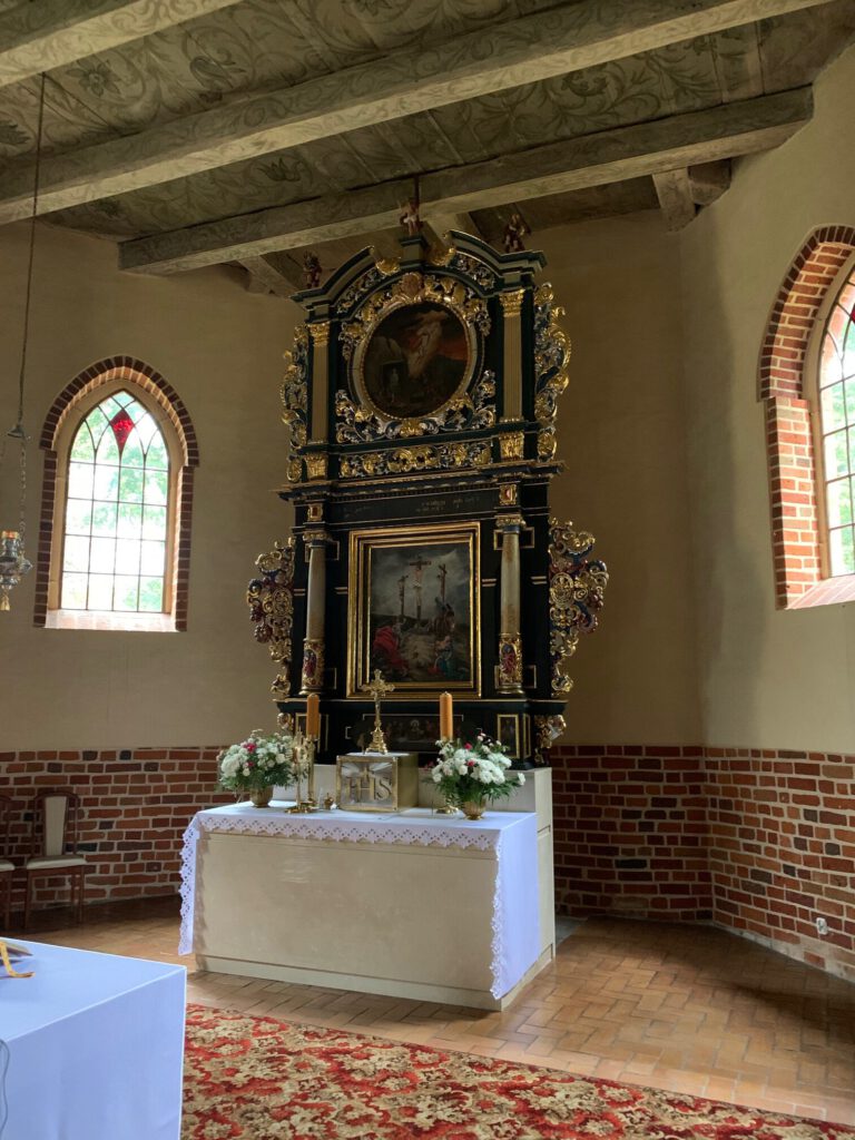 oben links ist das Taufbecken und der Altar vor 1945 zu sehen; Mitte rechts und unten ist die restaurierte originale Kirchenausstattung im Jahre 2020 zu sehen