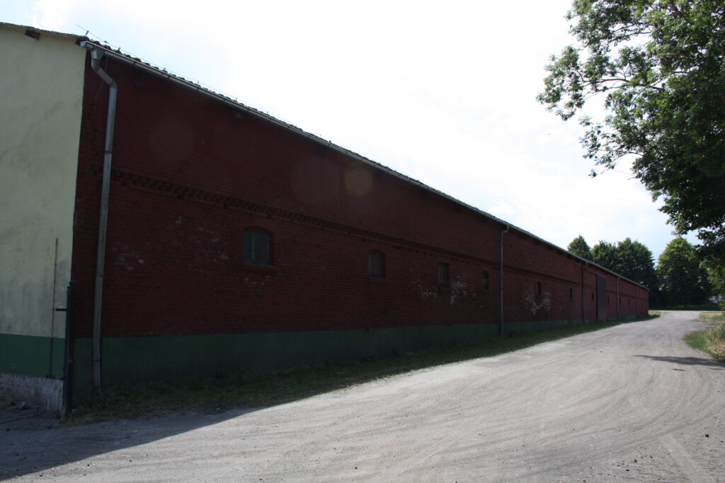 Bild links: erhaltene Scheune vom ehemaligen Gutshof  (siehe folgenden Kartenausschnitt: längstes Gebäude quer zur Straße)